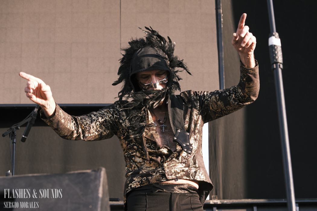 Y ya llegamos al final del festival con unos Ost+Front muy teatrales dentro del escenario con su cantante Hermann Ostfront llevando la batuta y siendo absoluto protagonista, y también fuera de él, con la teclista Eva bajando al publico para dar de beber (lo que suponemos era alcohol) desde una bolsa que aparentaba ser de sangre y a traves de un tubito. Con un sonido que nos recordó  mucho a Rammstein, lo disfrutamos casi tanto como el resto del publico, que estaba muy metido. Hubo un par de momentos que no nos terminaron de gustar en lo teatral, con humillaciones hacia la teclista, la unica mujer de la banda, y que seguramente estaban hecho para que así fuera (misión cumplida en ese caso).