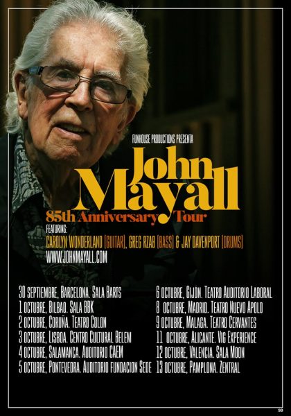 El legendario bluesman británico John Mayall dará inicio a su extensa gira española en Barcelona el próximo 30 de Septiembre en la sala Barts. De la mano de Funhouse Productions visitará desde el 30 de Septiembre hasta el 13 de Octubre Barcelona, Bilbao, A Coruña, Lisboa, Salamanca, Pontevedra, Gijón, Madrid, Málaga, Alicante, Valencia y Pamplona.